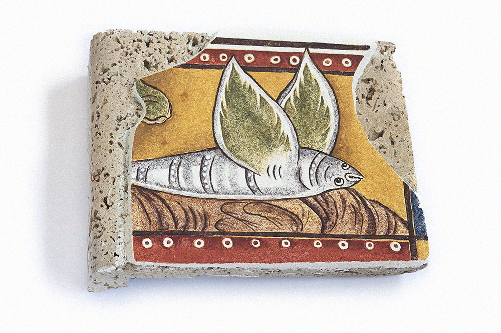 Figure 6: A fresco of flying fish by Maja Dolores Šubic, 2025. The fresco’s tufa base is reminiscent of latent spaces with its porous interior. Frescos represent an allegory to our argument as the intermediary between external art in the final layer and internal architecture with porous structure that supports the final layer.